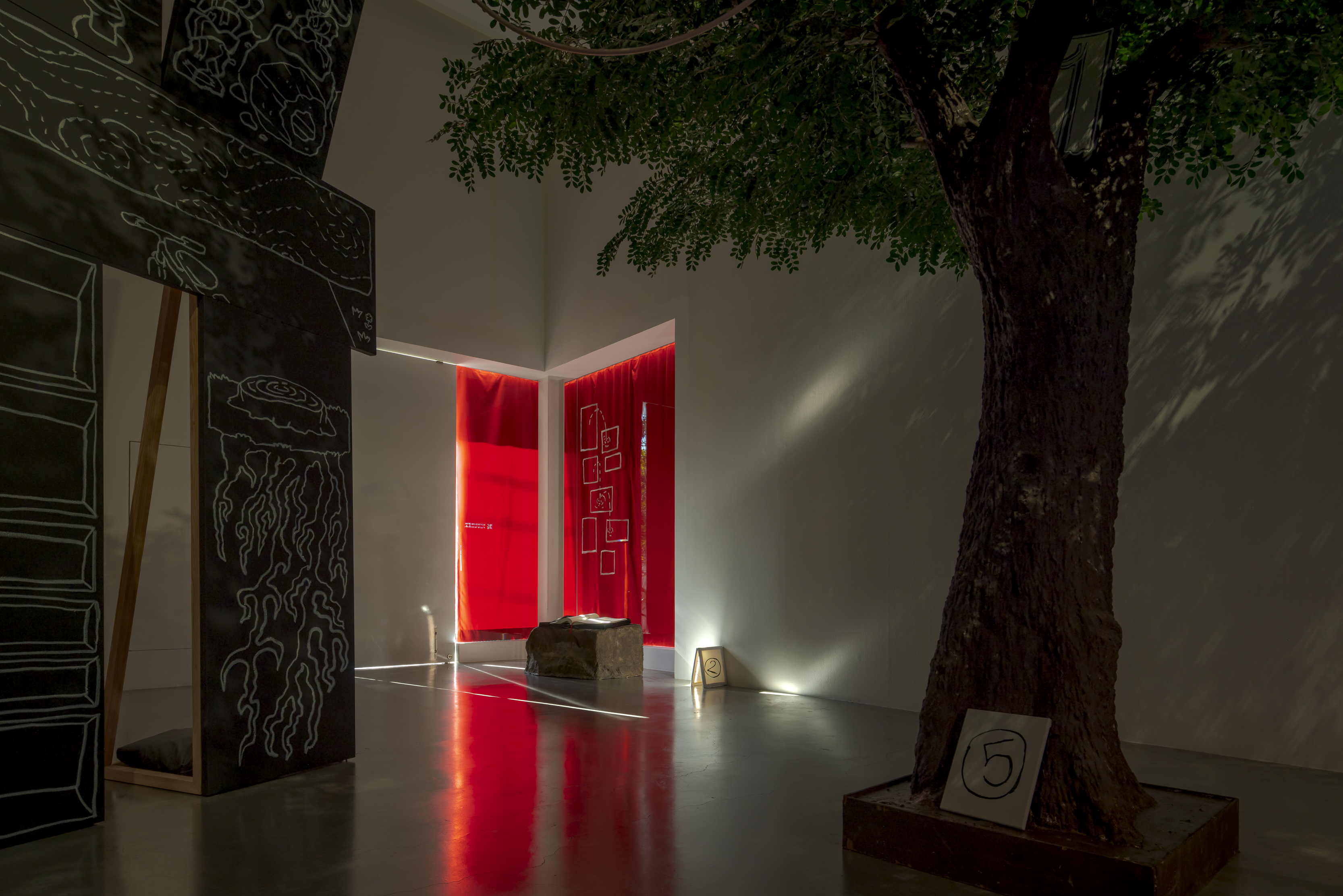 The exhibition also reflects on two formative stages of his childhood—primary school and university—as pivotal in shaping his archeogaming methodology and its connection to stagecraft. The exhibition draws from his experiences of stage blocking and interaction. His sculptures, covered in textured surfaces and filled with metaphorical “literary dust,” evoke the interplay between theatricality and game design. The stage emerges as a ritualistic and world-building space, intertwining narratives, backstage dynamics, and pre-production processes. Early cinema aesthetics further inform the exhibition, with the stage functioning as a threshold for stories—compressing and flattening narratives into singular moments before re-expanding them in new forms.